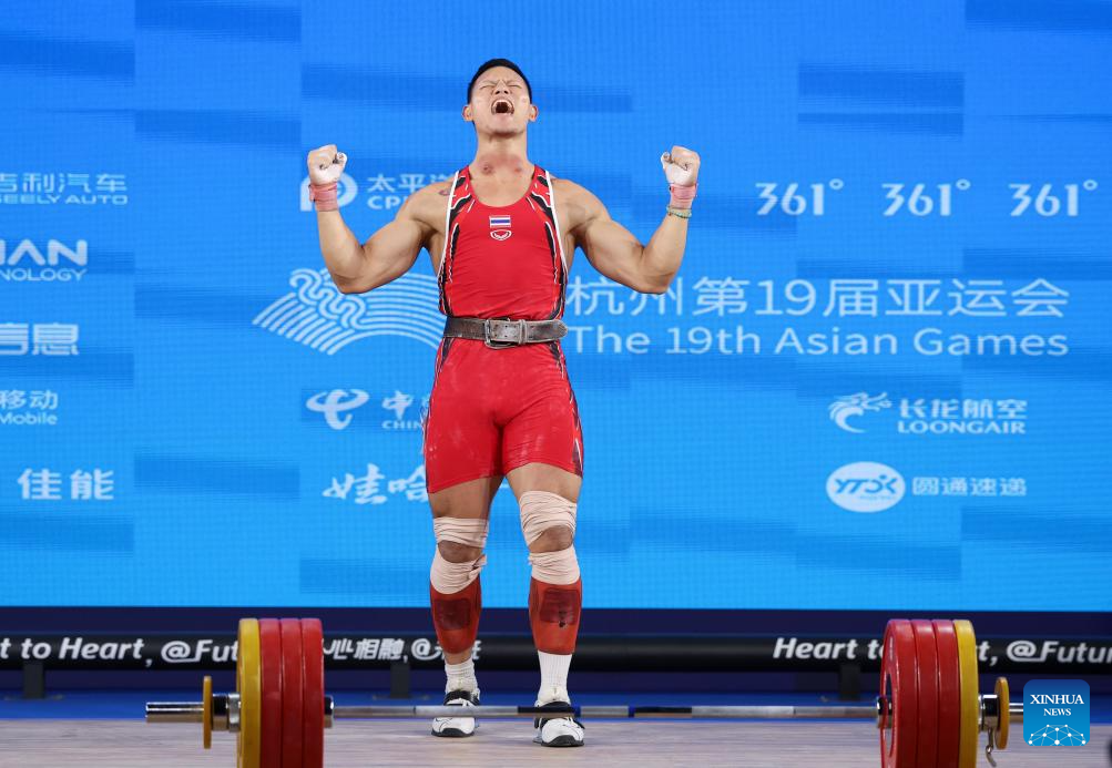Sarat Sumpradit of Thailand reacts during Men's 96Kg Group A match of Weightlifting at the 19th Asian Games in Hangzhou, east China's Zhejiang Province, Oct. 5, 2023. (Xinhua/Yang Lei)