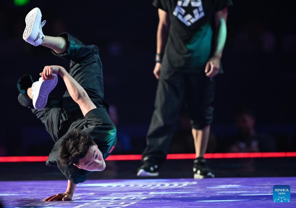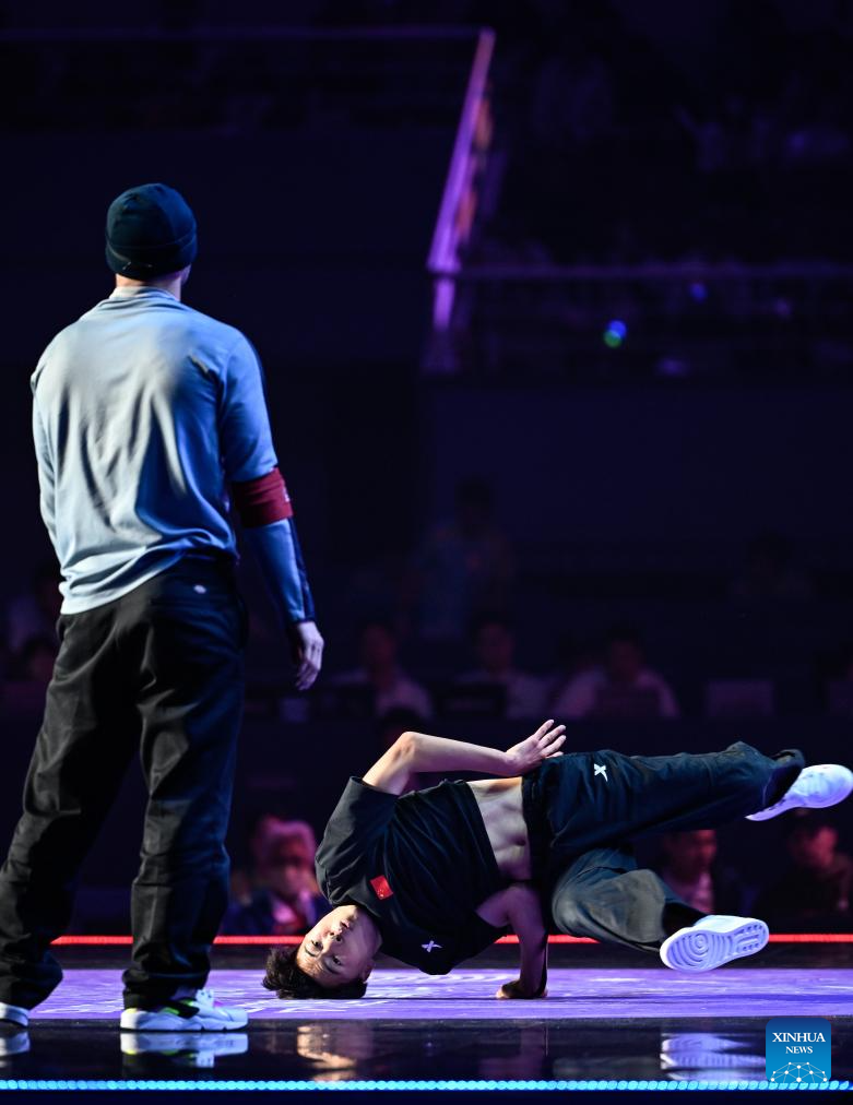 Qi Yuanxiang of China (L) competes during the men's group battle of breaking at the 19th Asian Games in Hangzhou, east China's Zhejiang Province, Oct. 6, 2023. (Xinhua/Yan Linyun)