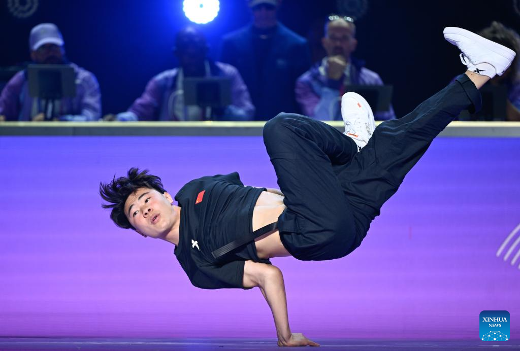 Liu Cheng Te of Chinese Taipei competes during the men's pre-selection of breaking at the 19th Asian Games in Hangzhou, east China's Zhejiang Province, Oct. 6, 2023. (Xinhua/Yan Linyun)
