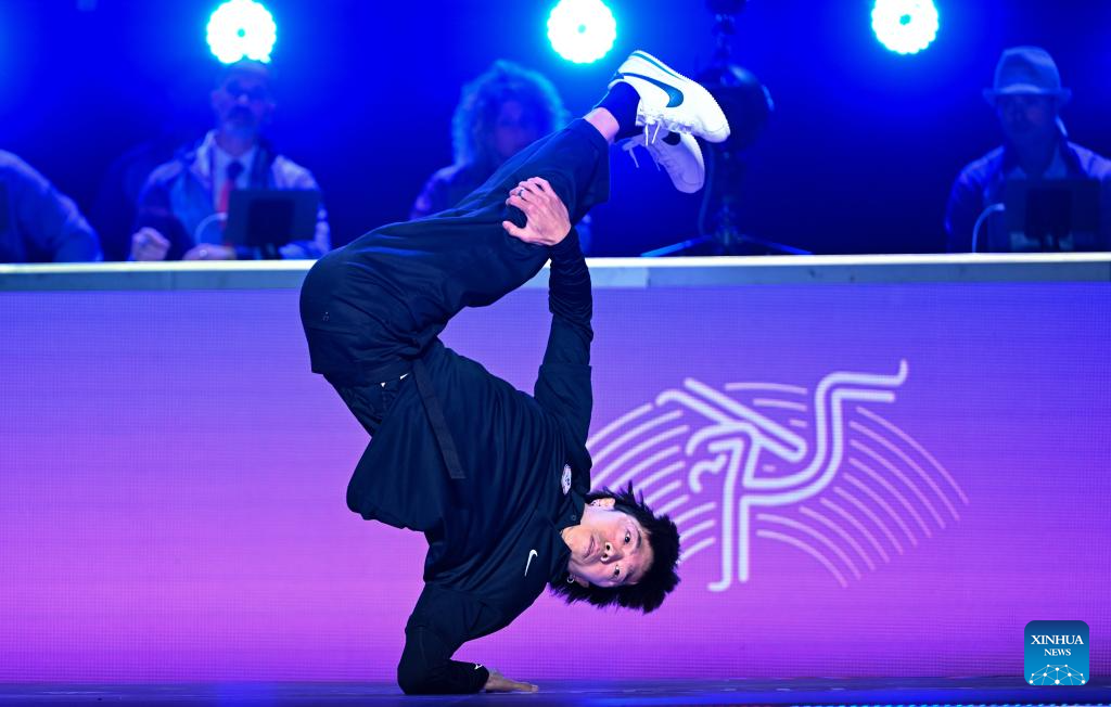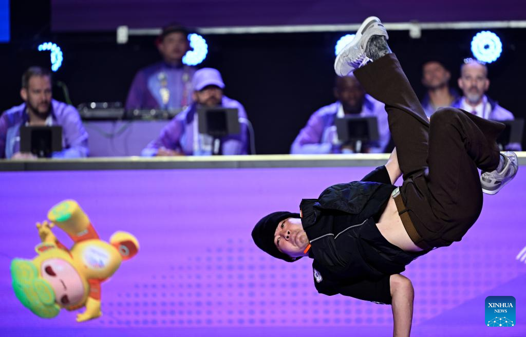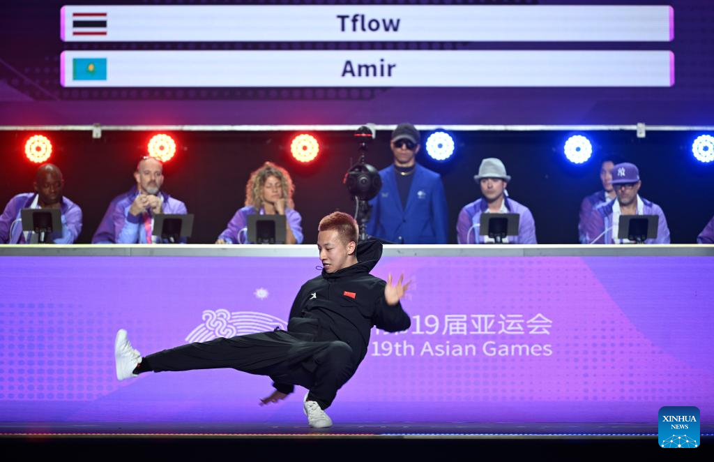 This photo shows a scene of the men's pre-selection of breaking at the 19th Asian Games in Hangzhou, east China's Zhejiang Province, Oct. 6, 2023. (Xinhua/Yan Linyun)