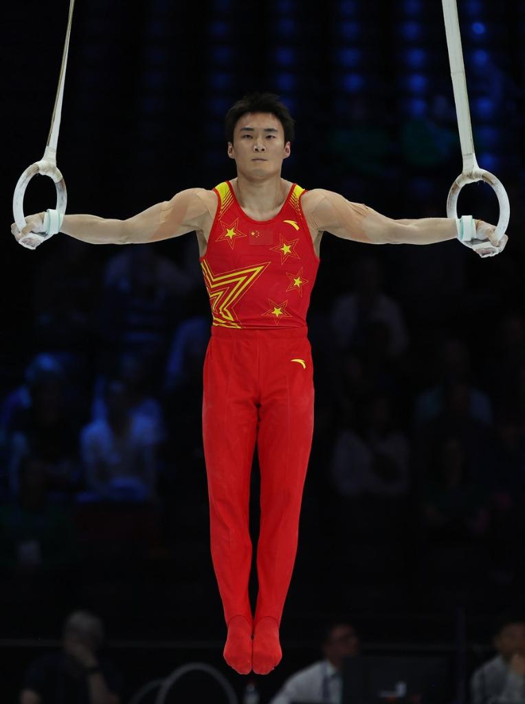 Sun Wei in action on the rings during the men's all around final. (Xinhua/Zheng Huansong)