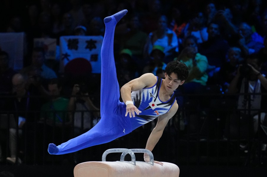 Daiki Hashimoto competes on the pommel horse during the men's all around final at the 2023 World Artistic Gymnastics Championships in Antwerp, Belgium, Oct. 5, 2023. (Xinhua/Zheng Huansong)