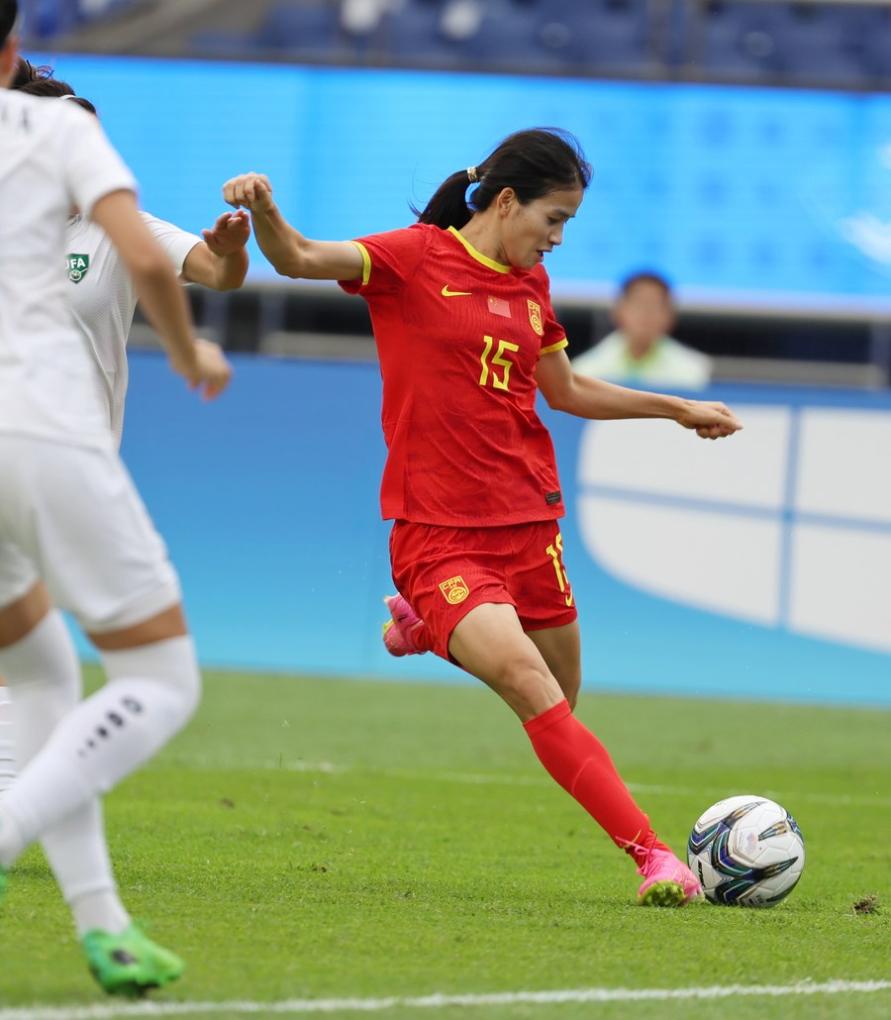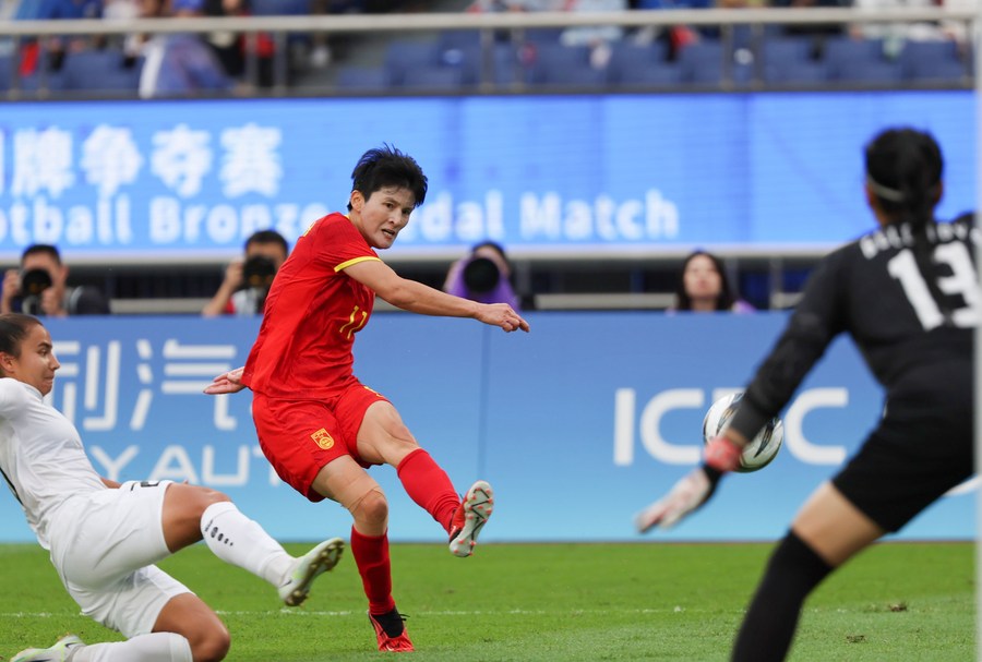 Wang Shanshan (C) takes a shot during the women's football bronze medal match against Uzbekistan at the Hangzhou Asian Games on Oct. 6, 2023. (Xinhua/Gong Bing)