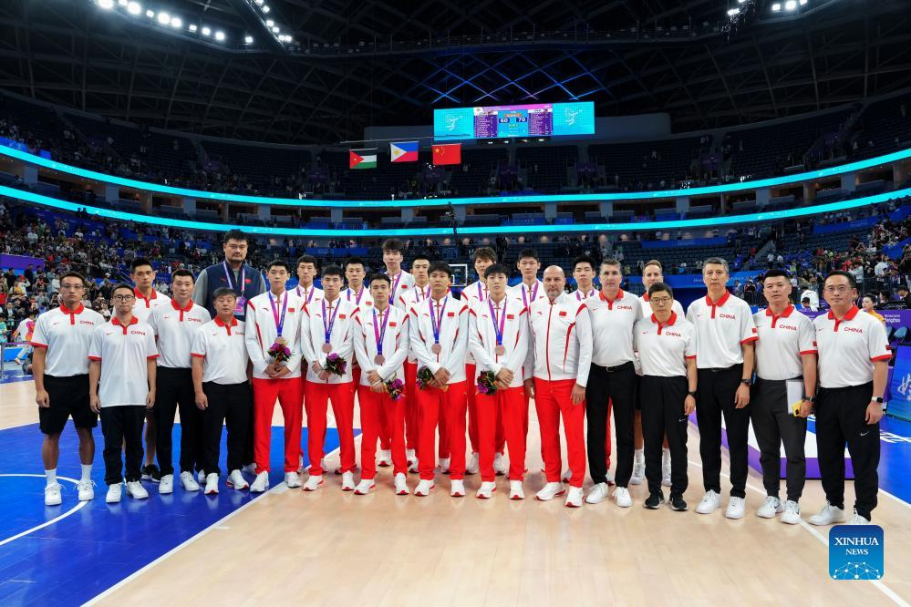 Team China attend medal ceremony for the Men's Basketball at the 19th Asian Games in Hangzhou, east China's Zhejiang Province, Oct. 6, 2023. (Xinhua/Meng Yongmin)