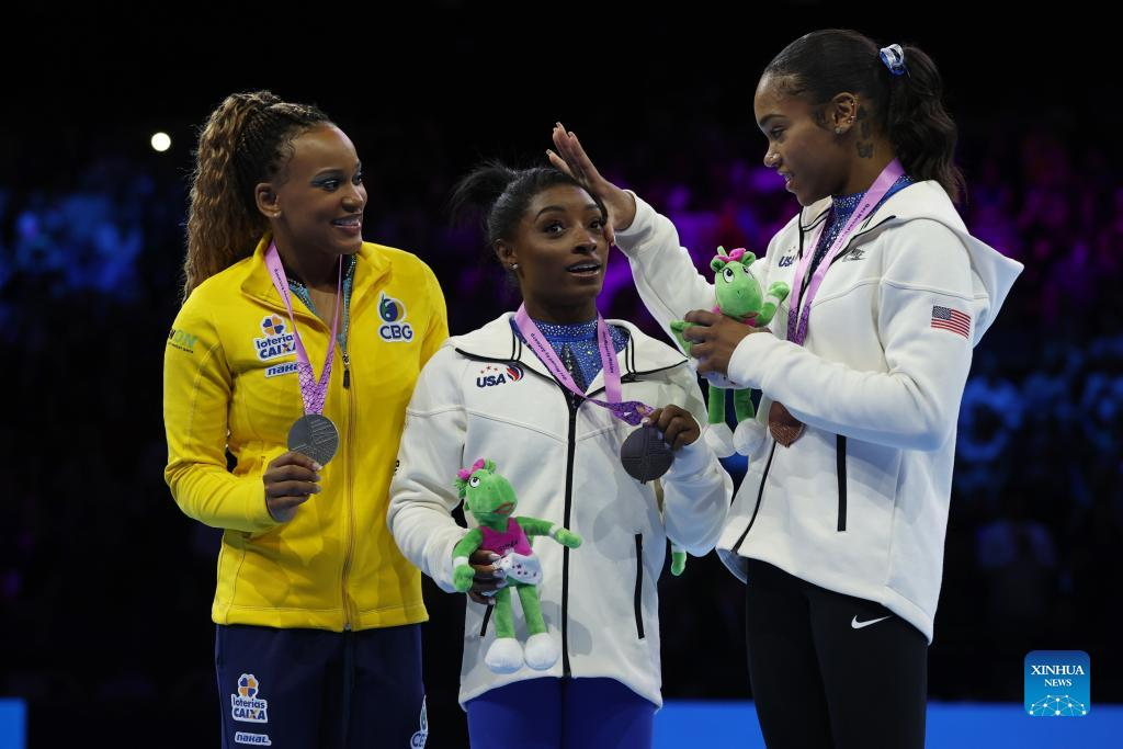 Gold medalist Simone Biles (C) of the United States, silver medalist Rebeca Andrade (L) of Brazil and bronze medalist Shilese Jones of the United States attend the awarding ceremony for the Women's All Around of the 2023 World Artistic Gymnastics Championships in Antwerp, Belgium, Oct. 6, 2023. (Xinhua/Zheng Huansong)