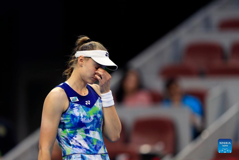 Elena Rybakina of Kazakhstan reacts during the women's singles semifinal between Elena Rybakina of Kazakhstan and Liudmila Samsonova of Russia at China Open tennis tournament in Beijing, capital of China, Oct. 7, 2023. (Xinhua/Luo Yuan)