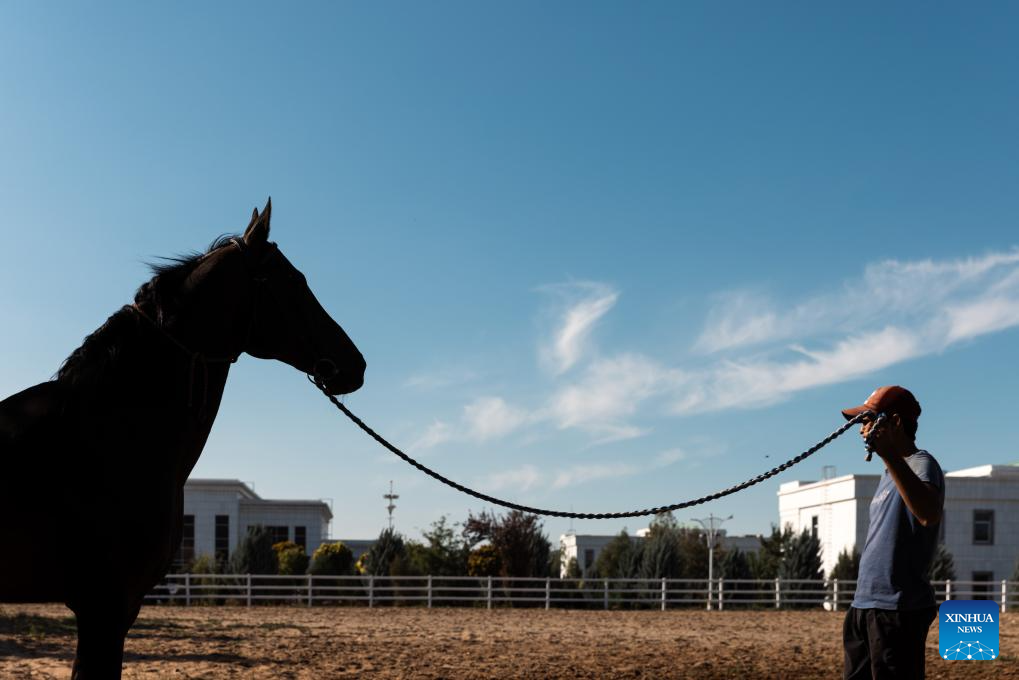 This photo taken on Sept. 26, 2023 shows an Akhal-Teke horse in Ashkhabad, Turkmenistan. Akhal-Teke horse is a national treasure of Turkmenistan and nicknamed "sweat blood horse" in China. (Xinhua/Wu Huiwo)