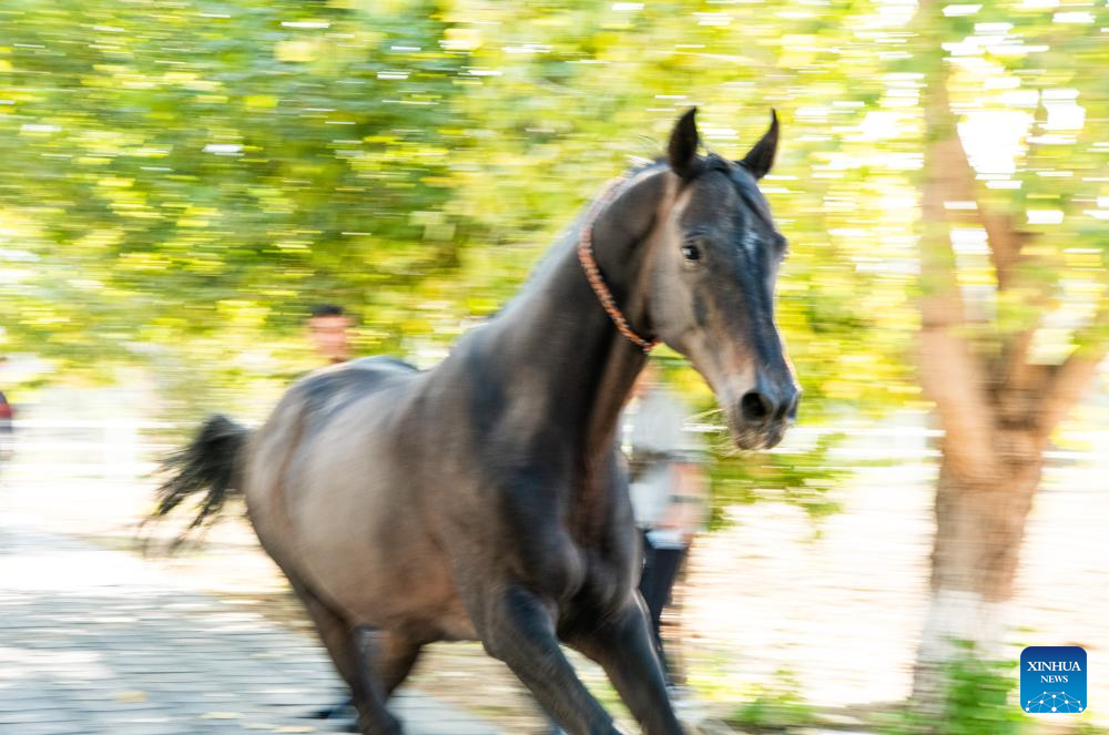 This photo taken on Sept. 26, 2023 shows an Akhal-Teke horse in Ashkhabad, Turkmenistan. Akhal-Teke horse is a national treasure of Turkmenistan and nicknamed "sweat blood horse" in China. (Xinhua/Li Muzi)