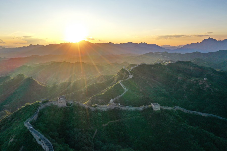 This aerial photo taken on Aug. 31, 2023 shows a view of the Jinshanling section of the Great Wall in Luanping County, north China's Hebei Province. (Xinhua/Mu Yu)