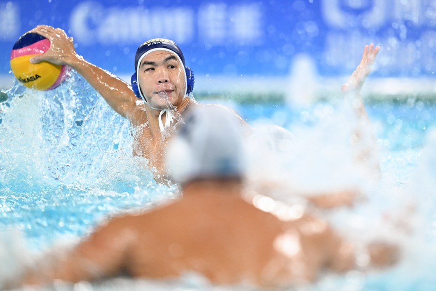 Chen Zhongxian of China in action during the men's water polo semifinal at the 19th Asian Games in Hangzhou, east China's Zhejiang Province on Oct. 6, 2023. (Xinhua/Xue Yuge)