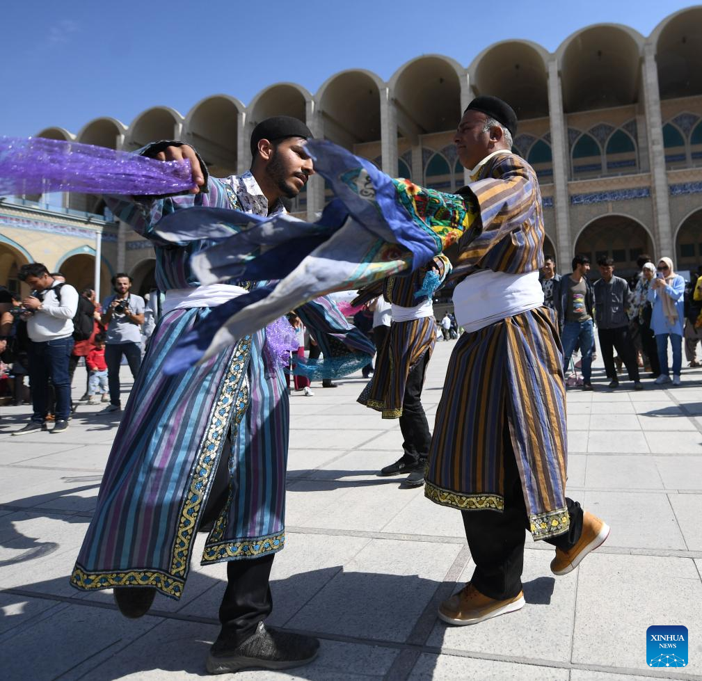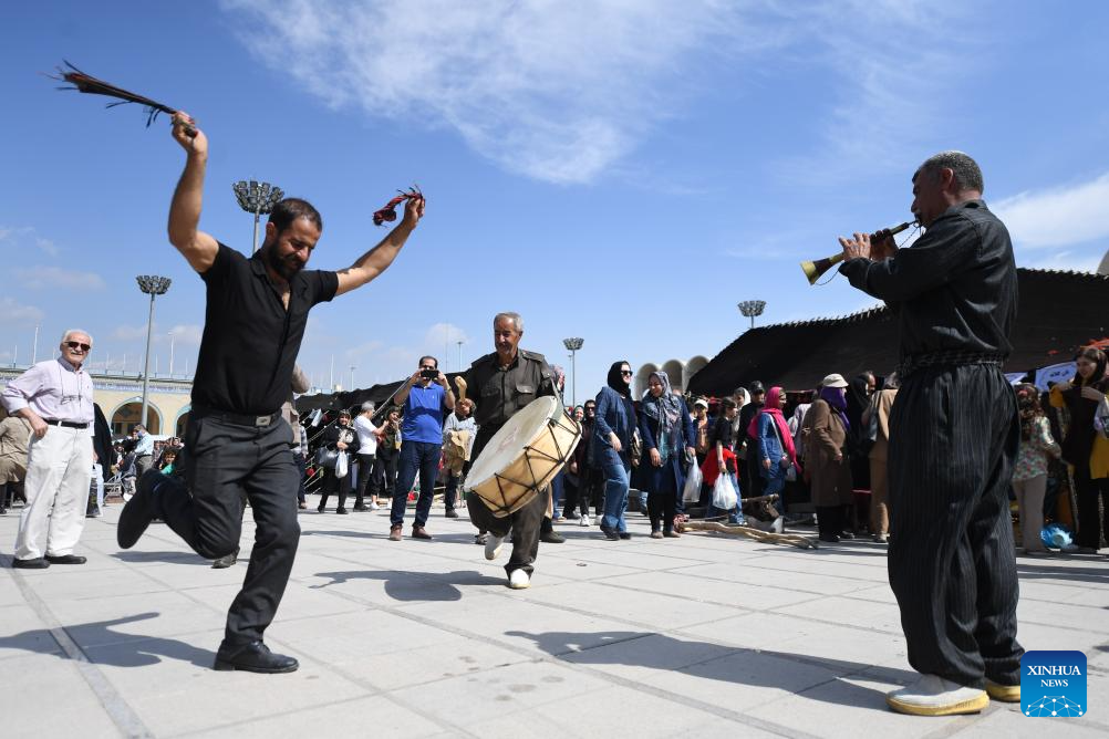 People dance at an event in Tehran, Iran, Oct. 5, 2023. People from all parts of the country gathered here to exhibit and sell traditional products. (Xinhua/Shadati)
