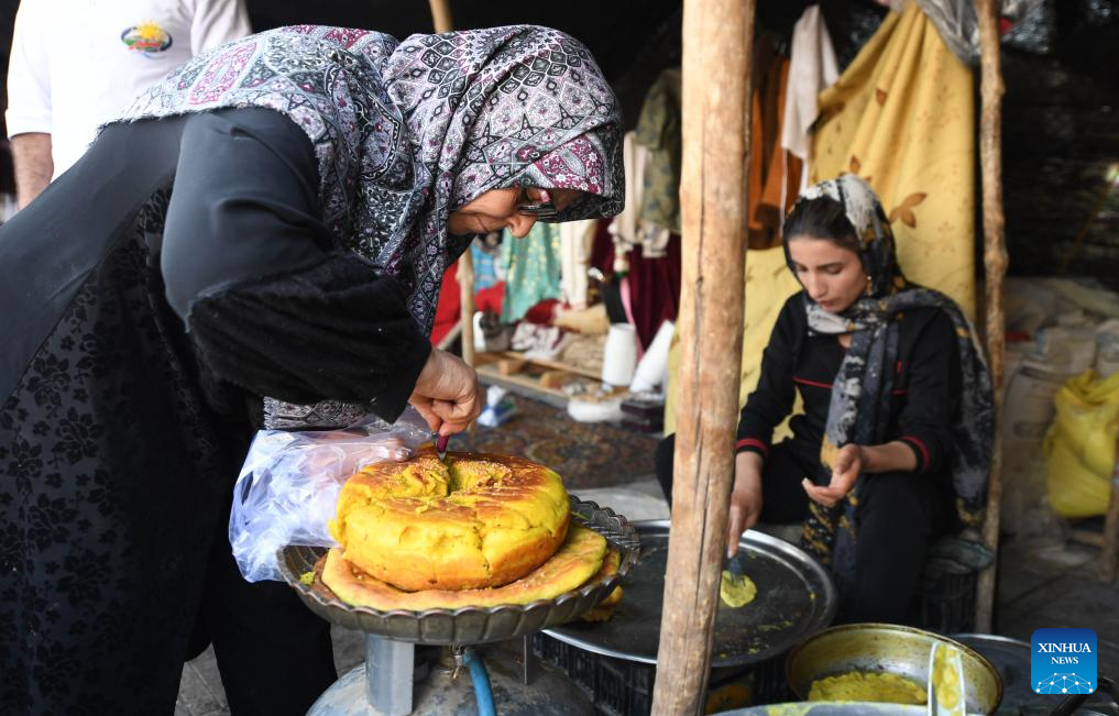 People make traditional foods in Tehran, Iran, Oct. 5, 2023. People from all parts of the country gathered here to exhibit and sell traditional products. (Xinhua/Shadati)