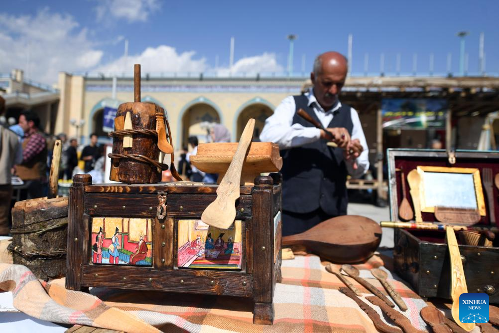 A man makes products in Tehran, Iran, Oct. 5, 2023. People from all parts of the country gathered here to exhibit and sell traditional products. (Xinhua/Shadati)