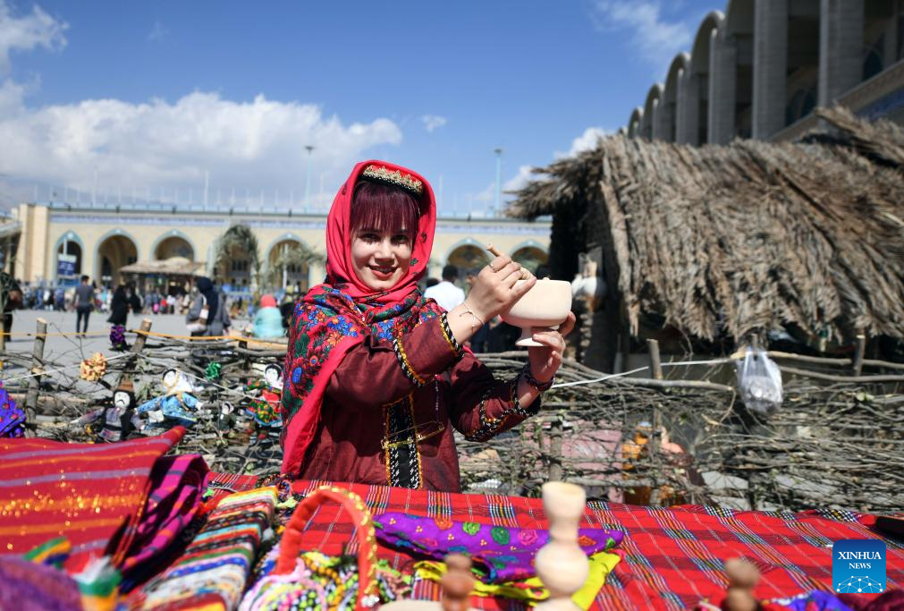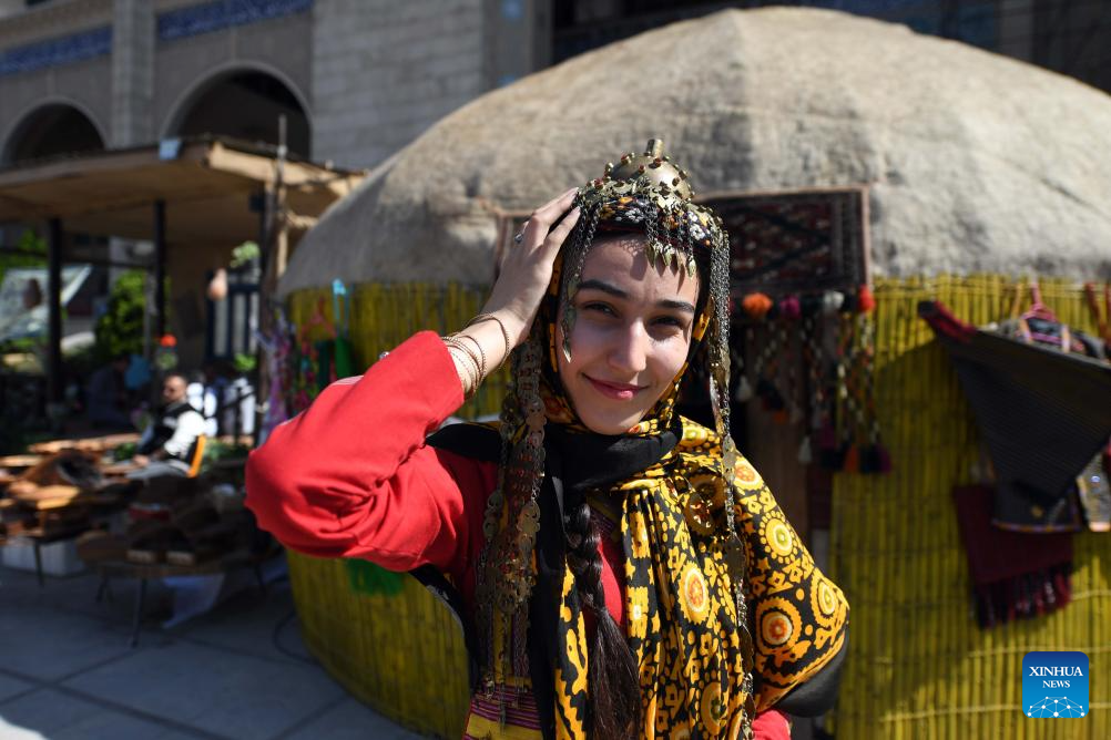 A woman in traditional costume displays a handmade product in Tehran, Iran, Oct. 5, 2023. People from all parts of the country gathered here to exhibit and sell traditional products. (Xinhua/Shadati)