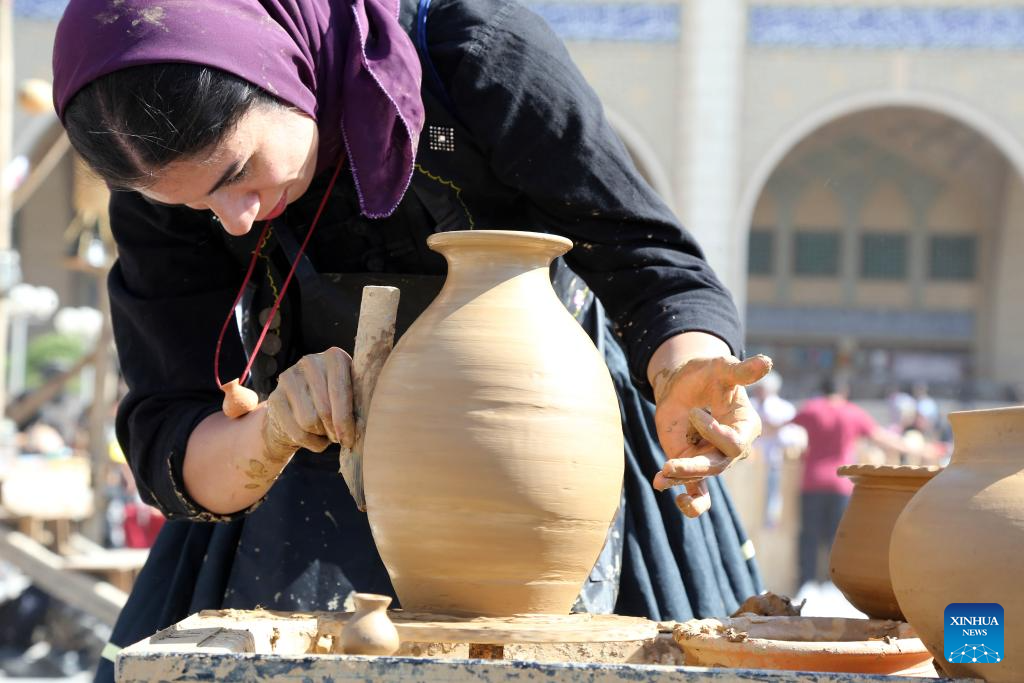 A woman demonstrates pottery making in Tehran, Iran, Oct. 5, 2023. People from all parts of the country gathered here to exhibit and sell traditional products. (Xinhua/Shadati)