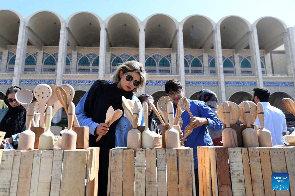 People buy handmade products in Tehran, Iran, Oct. 5, 2023. People from all parts of the country gathered here to exhibit and sell traditional products. (Xinhua/Shadati)