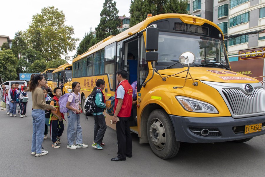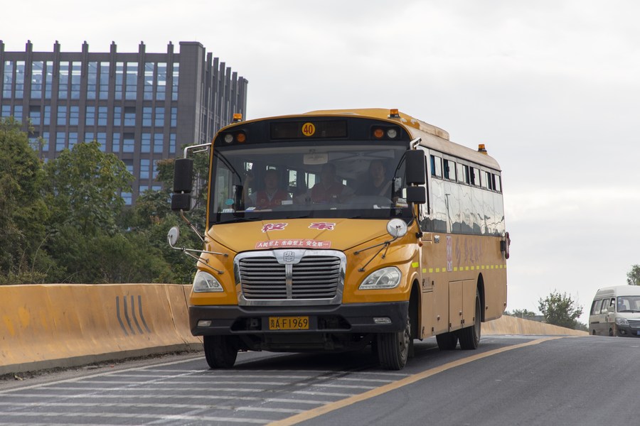 A school bus runs on a road at Guanshanhu District in Guiyang, southwest China's Guizhou Province, Sept. 7, 2023. (Xinhua)