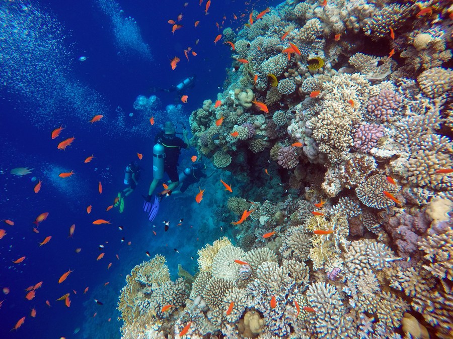 People dive around corals in the Blue Hole in Dahab, Egypt, on Oct. 2, 2023. (Xinhua/Sui Xiankai)