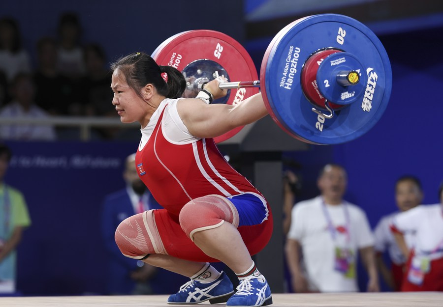 Jong Chun Hui of DPR Korea competes during the women's 76Kg weightlifting at the Hangzhou Asian Games, Oct. 5, 2023. (Xinhua/Yang Lei)