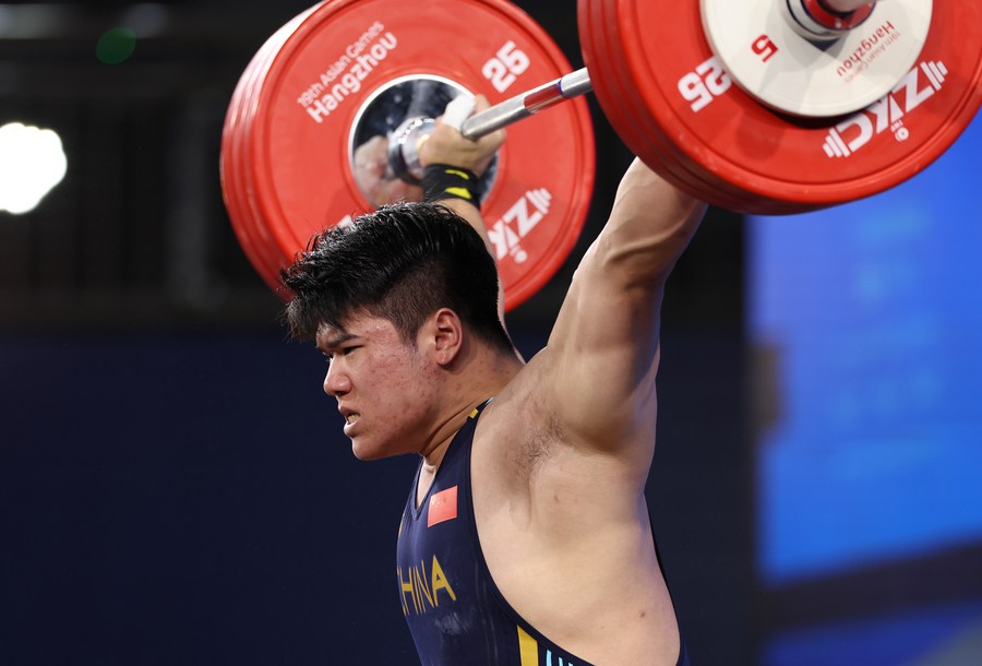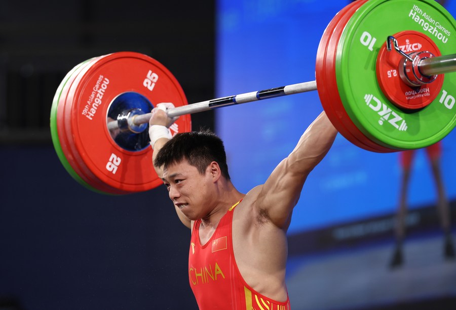 Chen Lijun of China competes during the Men's 67Kg Group A match of Weightlifting at the 19th Asian Games in Hangzhou, east China's Zhejiang Province, Oct. 1, 2023. (Xinhua/Yang Lei)