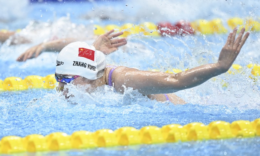 Zhang Yufei on her way to victory in the women's 50m butterfly final on Sept. 29, 2023. (Xinhua/Huang Zongzhi)