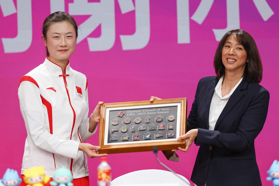 OCA Athletes Committee Chairperson Mikako Kotani (R) presents a gift to Ding Ning at an OCA press conference during the Hangzhou Asian Games, Oct. 7, 2023. (Xinhua/Pan Yulong)