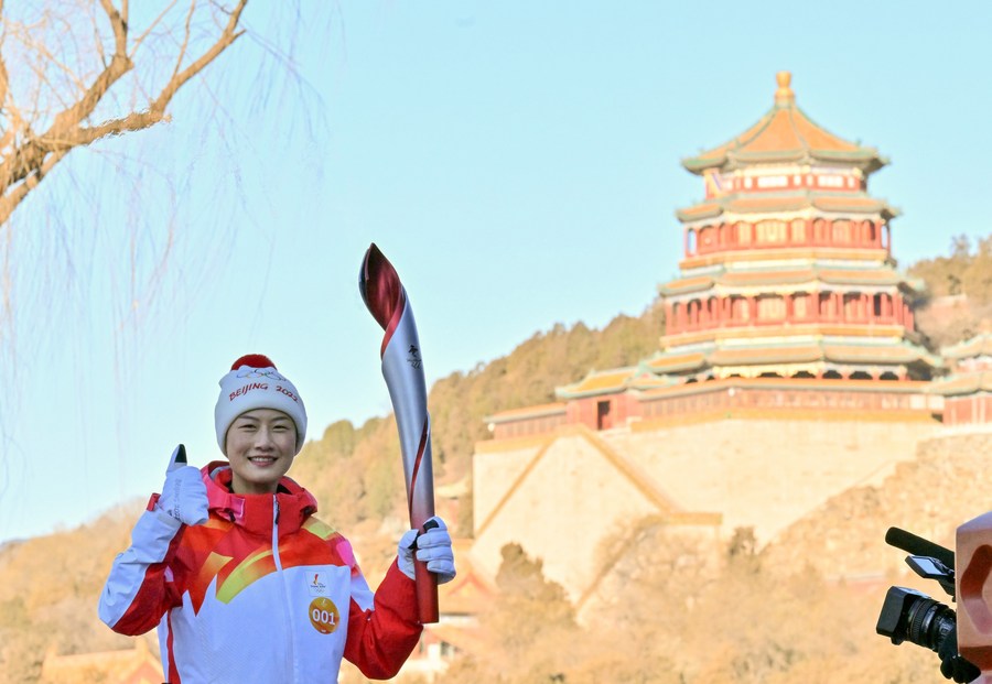 Torch bearer Ding Ning runs with the torch during the Beijing 2022 Olympic Torch Relay at the Summer Palace in Beijing, capital of China, Feb. 4, 2022. (Xinhua/Jin Liangkuai)