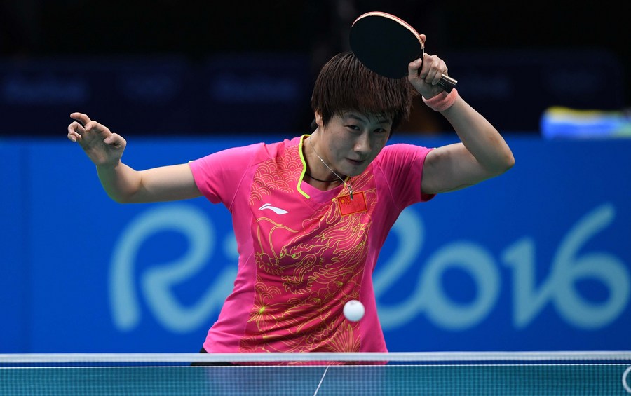 Ding Ning hits a return in the women's singles final against her compatriot Li Xiaoxia at the 2016 Rio Olympic Games, Aug. 10, 2016. (Xinhua/Lin Yiguang)