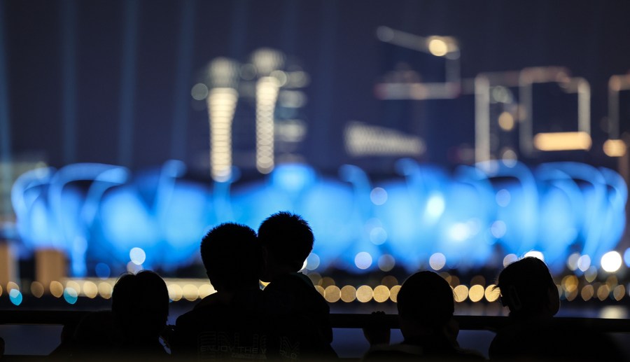 People look at the Hangzhou Olympic Sports Center Stadium in Hangzhou, east China's Zhejiang Province, Oct. 8, 2023. (Xinhua/Pan Yulong)