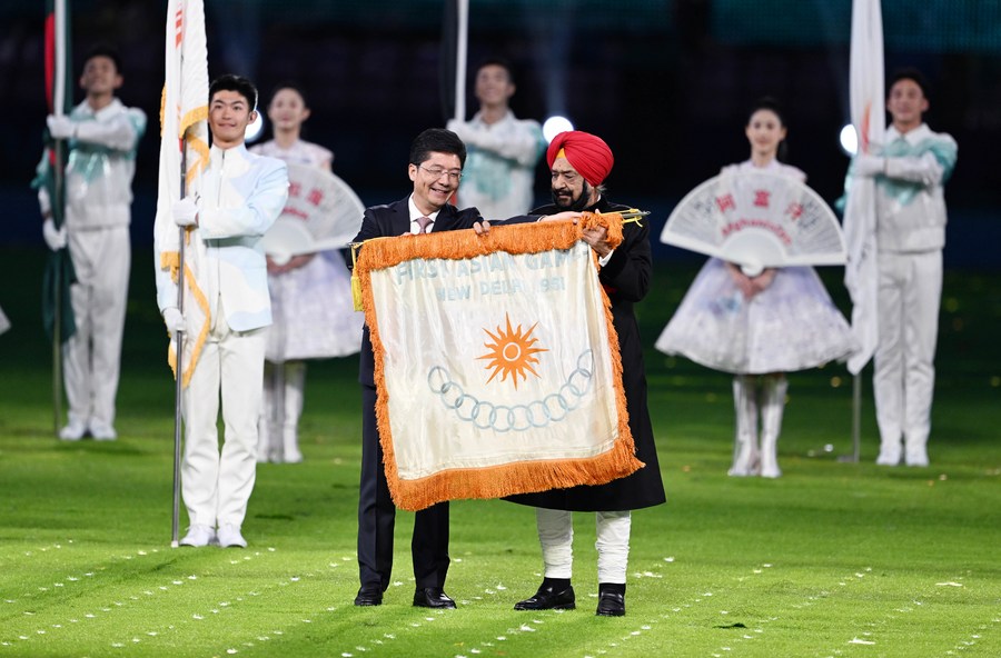 This photo taken on Oct. 8, 2023 shows the handover ceremony of the flag of the first Asian Games during the closing ceremony of the 19th Asian Games in Hangzhou, east China's Zhejiang Province. (Xinhua/Cheng Min)