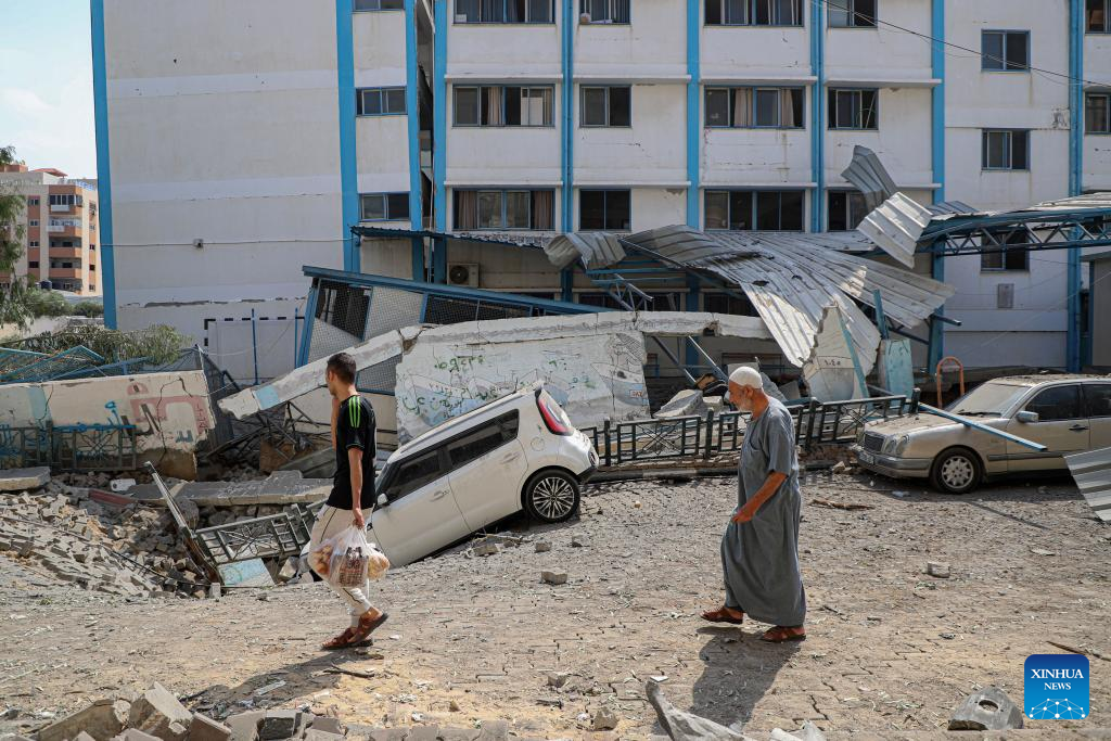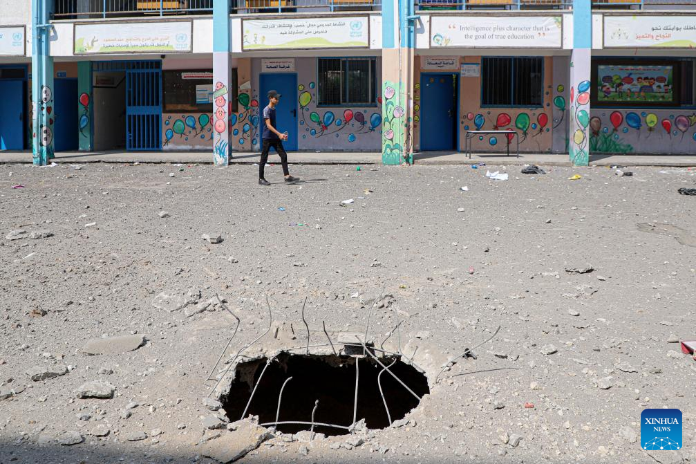 This photo taken on Oct. 8, 2023 shows damaged ground at a school following an Israeli airstrike in Gaza City.
