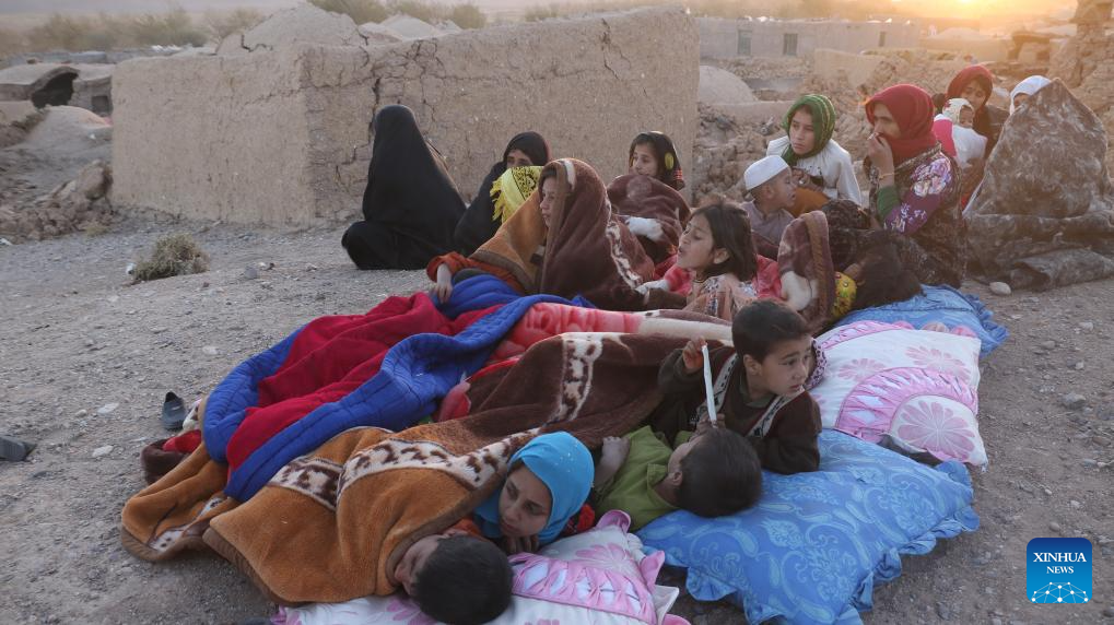 People affected by the earthquake rest outdoors in Herat Province, Afghanistan, Oct. 7, 2023. At least 120 people were killed and around 1,000 others injured as earthquakes shocked Afghanistan's Herat and other western provinces, a local official from Herat told reporters. According to the China Earthquake Networks Center, two earthquakes with a magnitude of 6.2 jolted Afghanistan on Saturday. (Photo by Mashal/Xinhua)