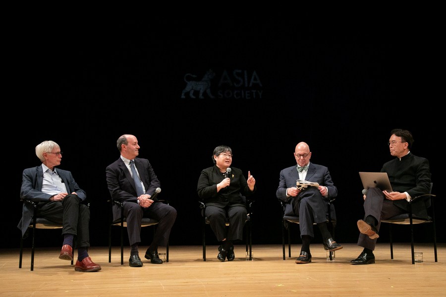 Orville Schell, director of the Center on U.S.-China Relations at Asia Society, Gary Ginstling, president and CEO of the New York Philharmonic, Chen Yi, professor at the Conservatory of Music and Dance at the University of Missouri-Kansas City, Leon Botstein, president of Bard College and founder of the innovative pre-professional orchestra The Orchestra Now, and Jindong Cai, director of the U.S.-China Music Institute and conductor of the Bard's East/West Ensemble (From L to R), participate in the U.S.-China Music Forum at The Asia Society in New York, the United States, Oct. 7, 2023. (Photo by Michael Nagle/Xinhua)