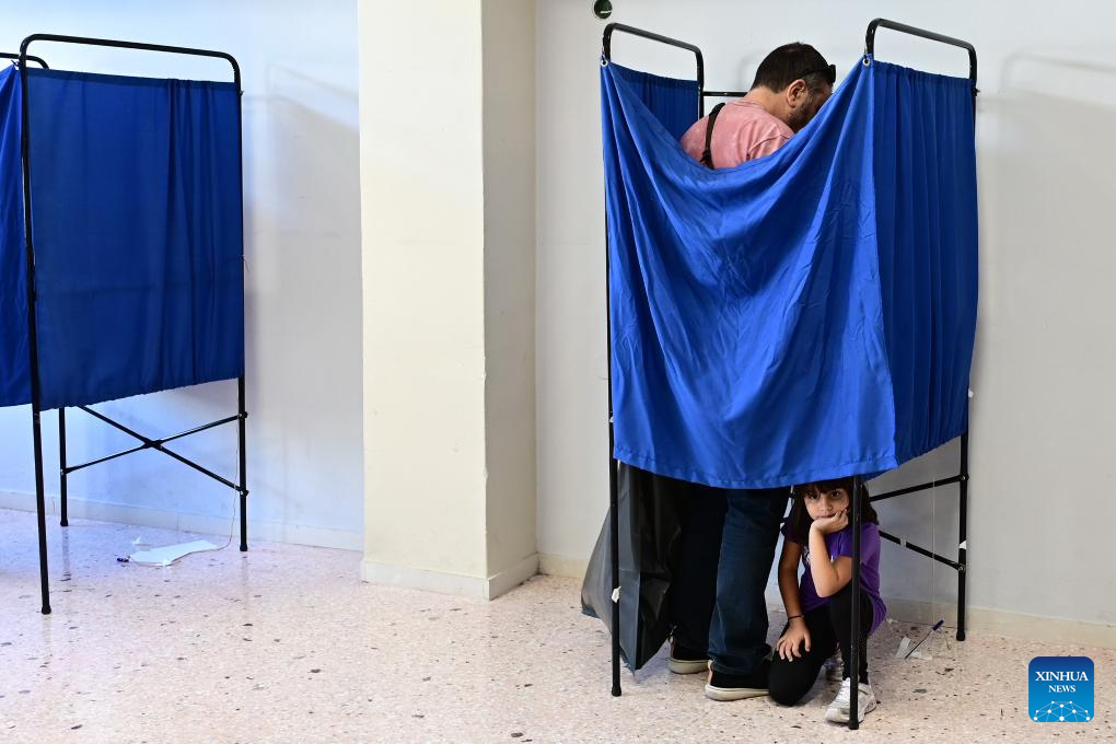 A girl is seen waiting for her father to cast his vote in Athens, Greece, Oct. 8, 2023. Greek conservatives of the ruling New Democracy (ND) party won seven out of 13 regions in the first round of regional elections on Sunday, according to the preliminary results released by the Interior Ministry, with about 40 percent of ballots counted till midnight. (Xinhua/Marios Lolos)