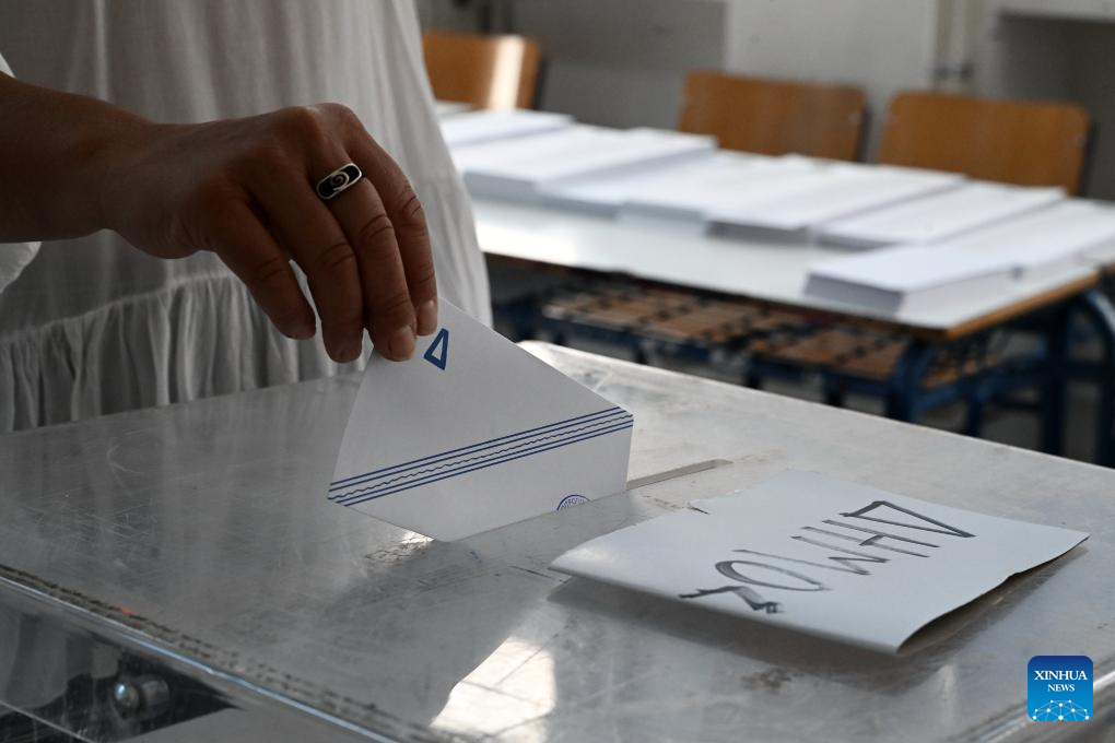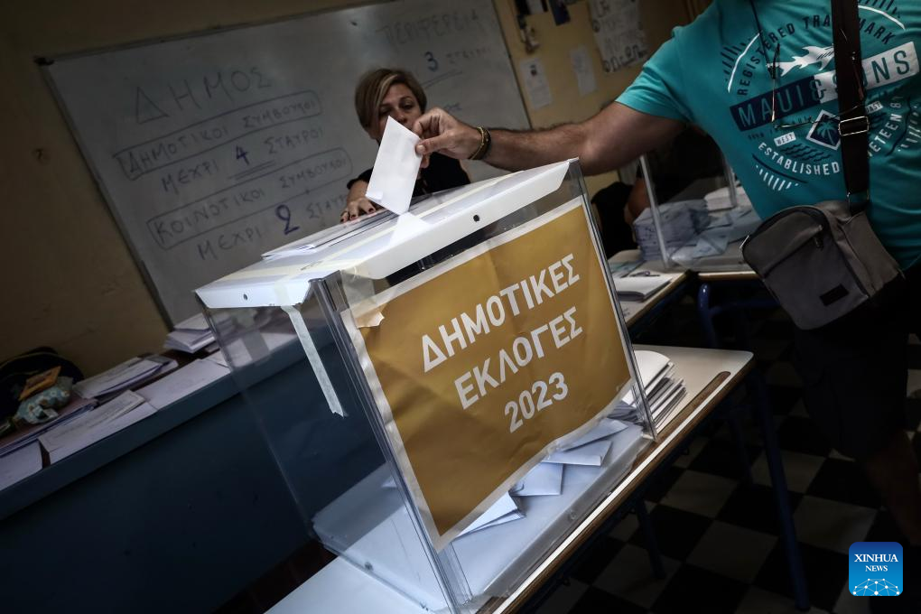 A man casts his vote for the regional elections in Athens, Greece, Oct. 8, 2023. Greek conservatives of the ruling New Democracy (ND) party won seven out of 13 regions in the first round of regional elections on Sunday, according to the preliminary results released by the Interior Ministry, with about 40 percent of ballots counted till midnight. (Xinhua/Marios Lolos)