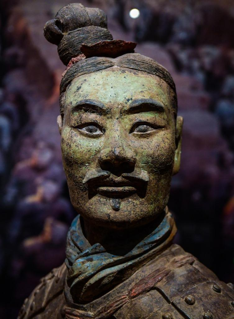 This photo taken on Aug. 23, 2023 shows a restored piece of the painted Terracotta Warriors at Emperor Qinshihuang's Mausoleum Site Museum in Xi'an, northwest China's Shaanxi Province. (Xinhua/Wang Yuguo)