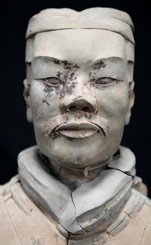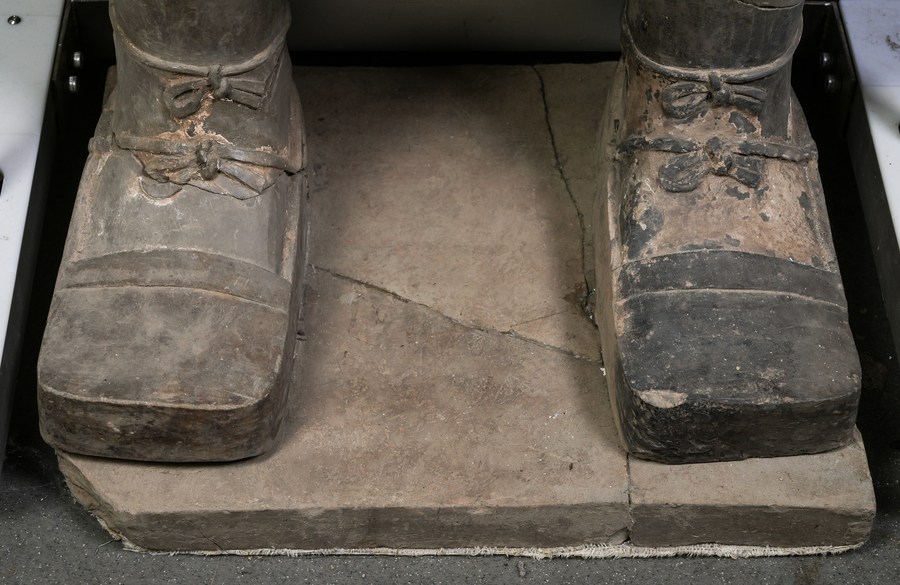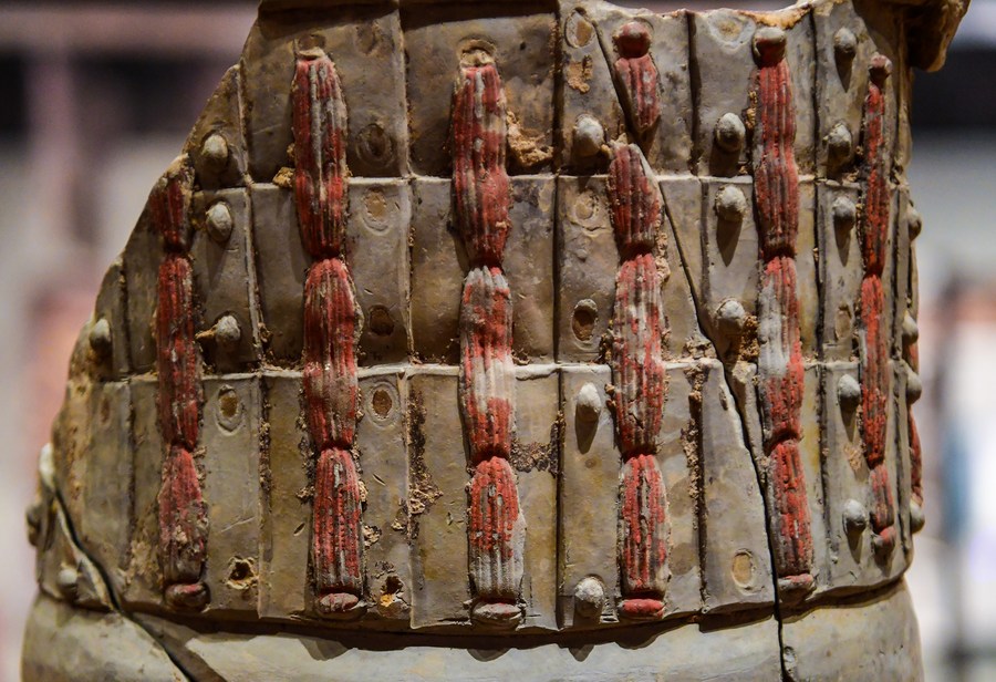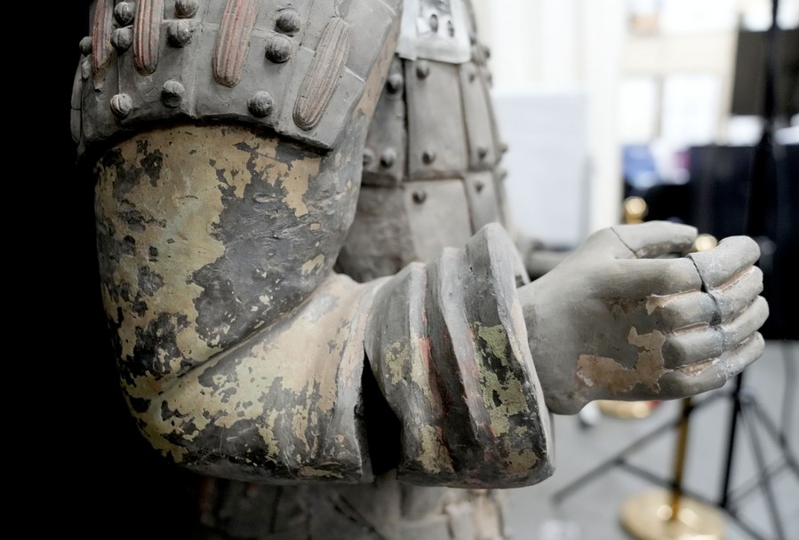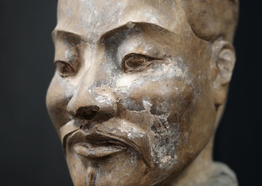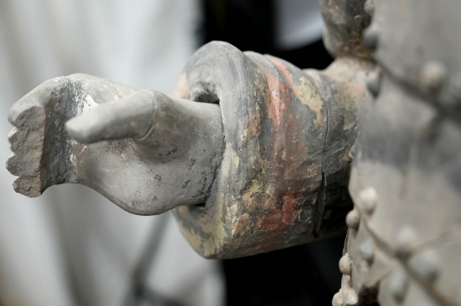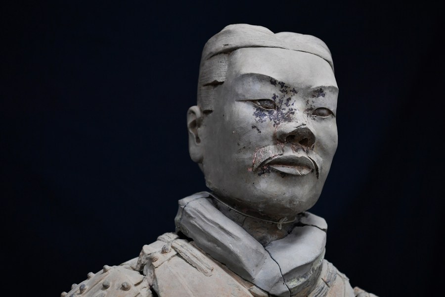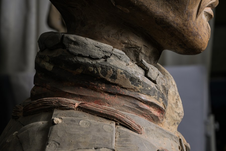 This photo taken on Aug. 23, 2023 shows a piece of the painted Terracotta Warriors at Emperor Qinshihuang's Mausoleum Site Museum in Xi'an, northwest China's Shaanxi Province. (Xinhua/Zhang Bowen)