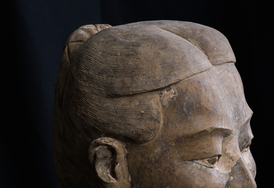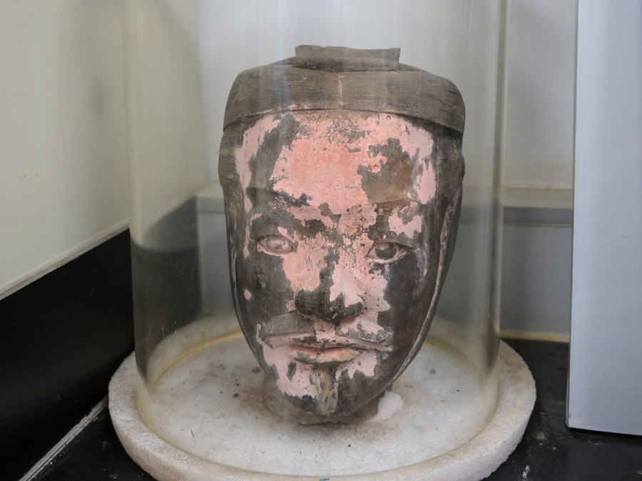 This photo taken on Aug. 23, 2023 shows a piece of the painted Terracotta Warriors at Emperor Qinshihuang's Mausoleum Site Museum in Xi'an, northwest China's Shaanxi Province. (Xinhua/Li He)