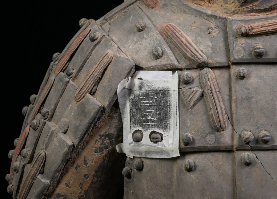 This photo taken on Aug. 23, 2023 shows a restored piece of the painted Terracotta Warriors at Emperor Qinshihuang's Mausoleum Site Museum in Xi'an, northwest China's Shaanxi Province. The writings on the statue indicate the name of the craftsman who made it. (Xinhua/Li He)