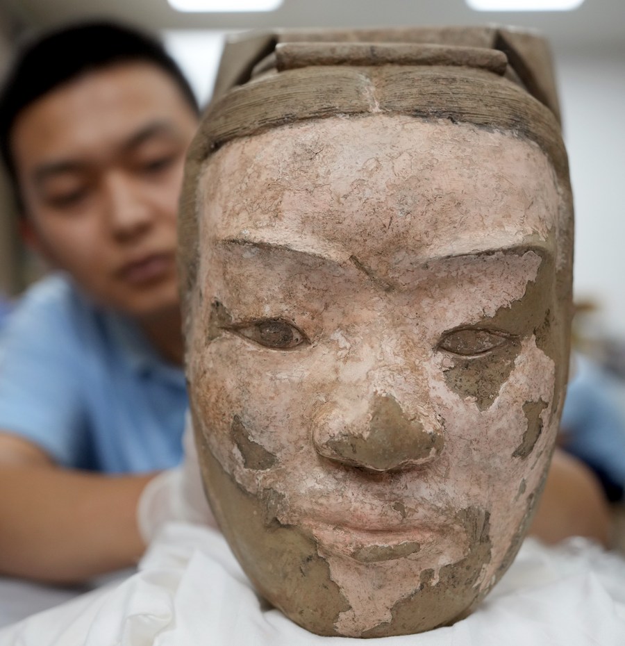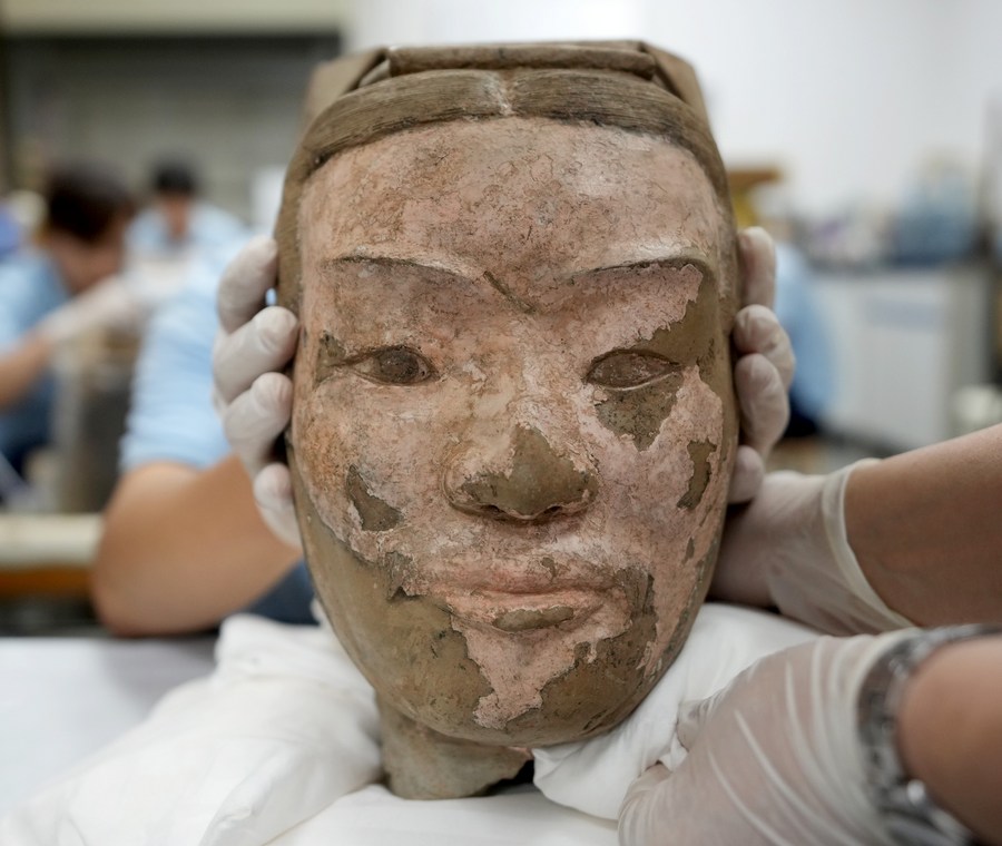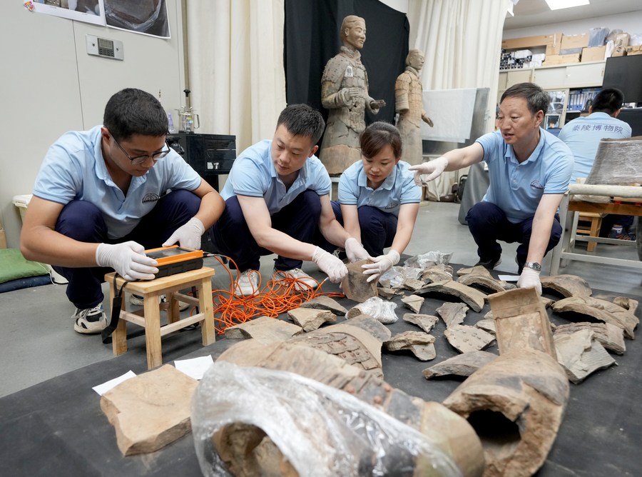 Technicians check a piece of the painted Terracotta Warrior at Emperor Qinshihuang's Mausoleum Site Museum in Xi'an, northwest China's Shaanxi Province, Aug. 23, 2023. (Xinhua/Wang Yuguo)