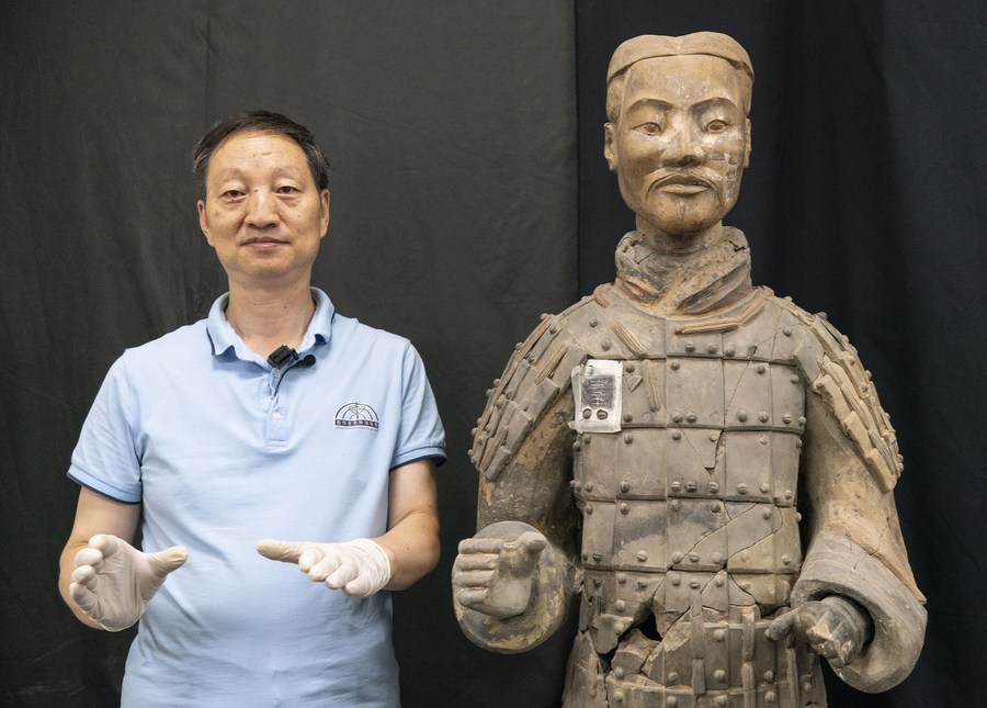 Lan Desheng gestures as a restored painted Terracotta Warrior at Emperor Qinshihuang's Mausoleum Site Museum in Xi'an, northwest China's Shaanxi Province, Aug. 23, 2023. (Xinhua/Cai Yang)