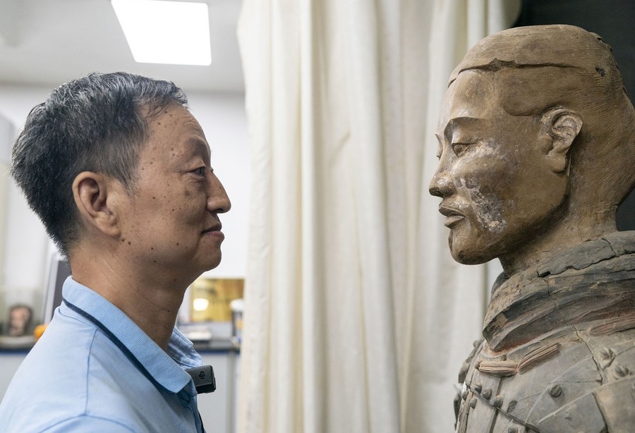 Lan Desheng looks at a painted Terracotta Warrior at Emperor Qinshihuang's Mausoleum Site Museum in Xi'an, northwest China's Shaanxi Province, Aug. 23, 2023. (Xinhua/Cai Yang)