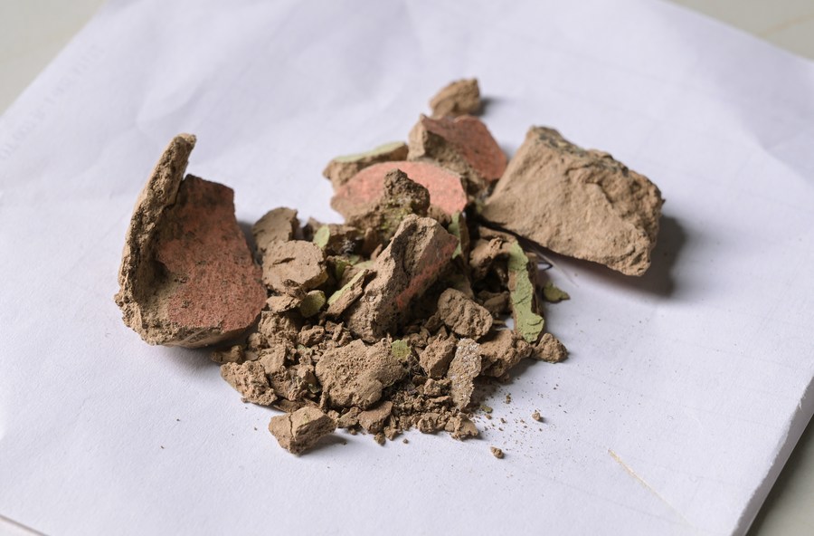 This photo taken on Aug. 23, 2023 shows painted clods to be restored at Emperor Qinshihuang's Mausoleum Site Museum in Xi'an, northwest China's Shaanxi Province. (Xinhua/Li He)