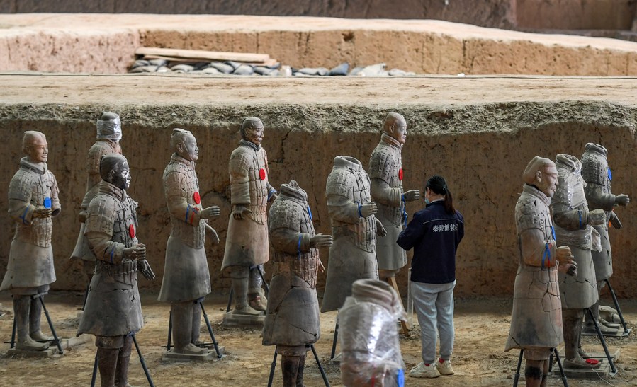 A staff member repairs a Terracotta Warrior at the pit No.1 of Emperor Qinshihuang's Mausoleum Site Museum in Xi'an, northwest China's Shaanxi Province, April 26, 2023. (Photo by Zou Jingyi/Xinhua)