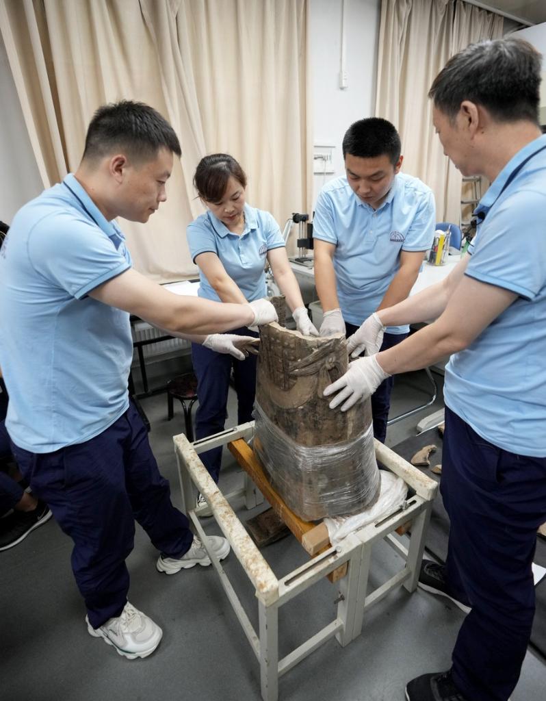 Lan Desheng (1st R) guides technicians to measure the density of the painted Terracotta Warriors with an ultrasonic device at Emperor Qinshihuang's Mausoleum Site Museum in Xi'an, northwest China's Shaanxi Province, Aug. 23, 2023. (Xinhua/Wang Yuguo)