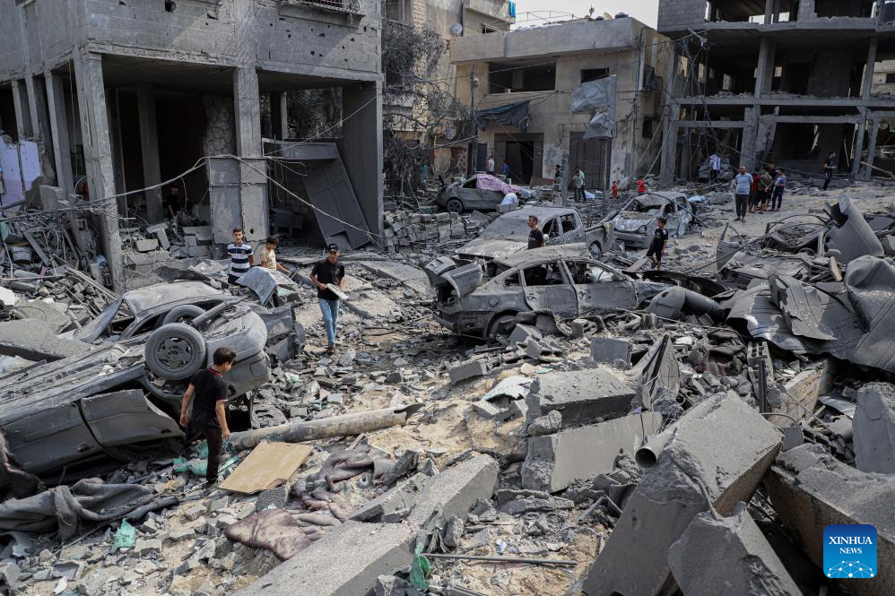 People inspect destroyed buildings following an Israeli airstrike in Gaza City on Oct. 9, 2023. The death toll and injuries from Israeli attacks on the Gaza Strip have risen to 560 and over 2,900, respectively, according to an update issued by the Palestinian Health Ministry on Monday.