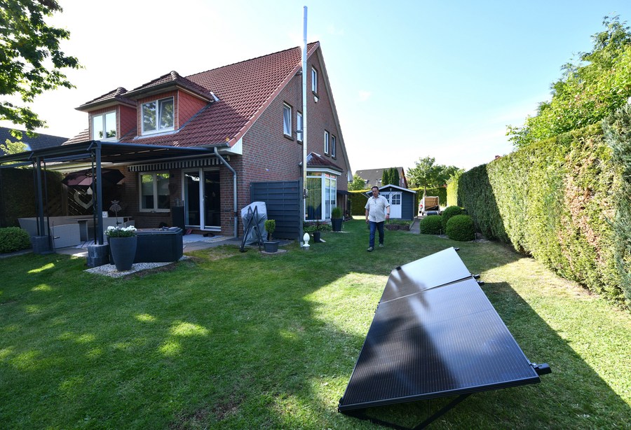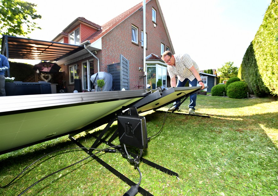 Dirk Heil installs the Chinese-made solar-powered equipment at his house in Schwarzenbek, Germany, May 30, 2023. (Xinhua/Ren Pengfei)