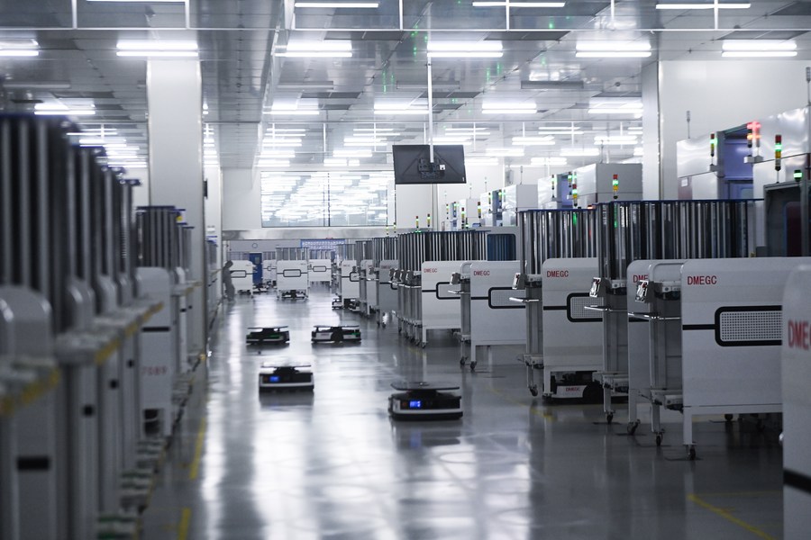 This photo taken on April 18, 2023 shows an interior view of the workshop of Hengdian Group DMEGC Magnetics Co., Ltd. in Dongyang City, east China's Zhejiang Province. (Xinhua/Xu Yu)