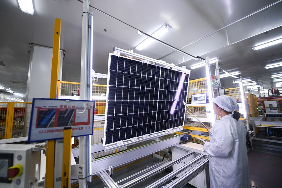 A staff member checks photovoltaic modules at the workshop of Hengdian Group DMEGC Magnetics Co., Ltd. in Dongyang City, east China's Zhejiang Province, April 18, 2023. (Xinhua/Xu Yu)