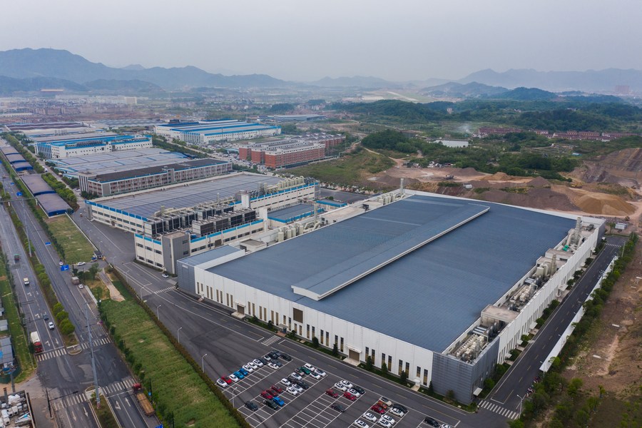 This aerial photo taken on April 18, 2023 shows an exterior view of the workshop of Hengdian Group DMEGC Magnetics Co., Ltd. in Dongyang City, east China's Zhejiang Province. (Xinhua/Xu Yu)